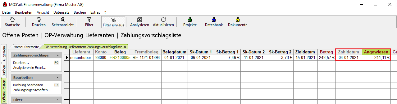 In diesem Fall werden alle markierten OPs mit dem ggf. zu diesem Zahldatum möglichen Skontoabzug zur Zahlung angewiesen.