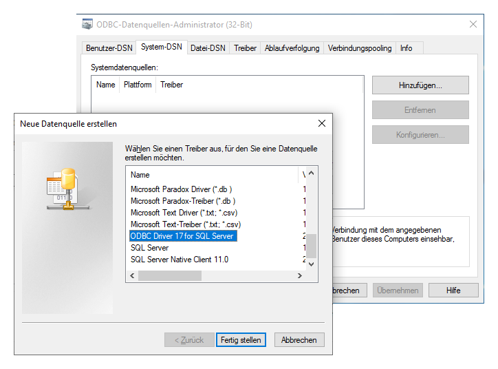 Wählen Sie mit den Treiber ODBC Driver 17 for SQL Server® aus und bestätigen Sie mit :