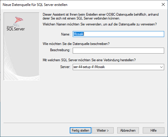 Geben Sie den Namen der verbundenen Datenbank ein (z.B. Mosaik) und wählen Sie den SQL Server (mit Instanz) aus der Auswahlliste aus (hier z.B. Servername "ser-44-setup-4" mit Instanzname "Mosaik"):