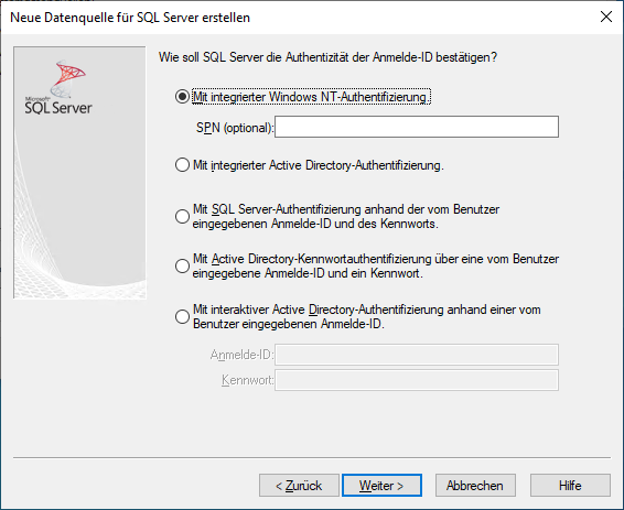 Wählen Sie im folgenden Dialog Mit integrierter Windows-NT Authentifizierung und klicken Sie auf :