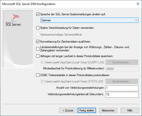 Im folgenden Dialog sollte die Sprache fest auf Deutsch (German) eingestellt werden, mit wird die System DSN angelegt: