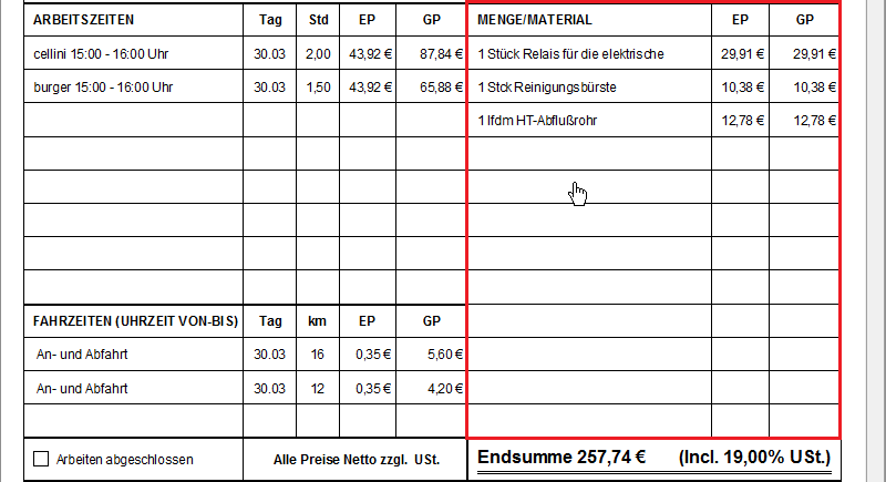 Preisen auf dem Arbeitszettel kann durch eine Änderung des