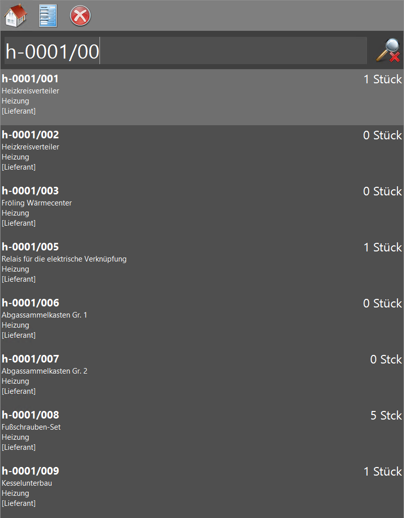 Wählen Sie einen Artikel durch Antippen aus. Es werden nur die Artikel angezeigt, die Sie in Abschnitt 3.2.5, „Artikelstammdaten pro Artikelgruppe“ bzw. Abschnitt 3.2.6, „Artikelstammdaten auf Basis von Lagern“ für den mobilen Service ausgewählt haben! Die Eingabe von Begriffen im Suchfeld reduziert die Liste der angezeigten Ergebnisse schon beim (Vor-) Tippen auf solche, die alle Begriffe in der Artikelnummer, im Matchcode oder im Kurztext des Artikels enthalten. Wie in MOS'aik kann bei der Suche ein +-Zeichen zum Suchen von mehreren Begriffen verwendet werden. Die Eingabe von "draht+34" führt zu einer Suche von Datensätzen, die sowohl die Zeichenfolge "draht" als auch "34" enthalten und ist identisch mit der Eingabe von "draht 34". Am rechten Rand der Liste werden die ggf. verfügbaren Fahrzeuglagerbestände angezeigt (siehe Abschnitt 3.2.6, „Artikelstammdaten auf Basis von Lagern“). Es werden nur Artikel nachgeschlagen, die nicht „Ausgeblendet“ sind. Beim Suchen von Artikeln wird