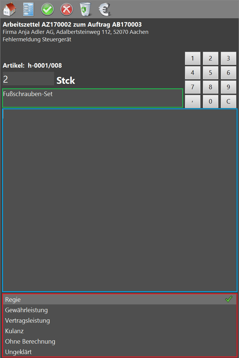 Im oberen Bereich geben Sie die Artikelmenge ein. Verwenden Sie den eingeblendeten Ziffernblock zur Eingabe. Die Materialpreise werden abhängig vom Abrechnungsmodus (siehe dazu auch den Themenbereich "Serviceaufträge mit Regieabrechnung") bestimmt. Wählen Sie diesen dazu durch Antippen einer Zeile im unteren Bereich (rot umrandet) aus. Der ausgewählte Abrechnungsmodus wird am rechten Rand durch einen grünen Haken gekennzeichnet. Zur Änderung der Artikelbeschreibung tippen Sie in den mittleren Bereich (blau umrandet). Hier steht Ihnen wieder die eingeblendete Bildschirmtastatur zur Eingabe zur Verfügung. Zur Änderung des Artikelkurztextes tippen Sie in den grün umrandeten Bereich. |