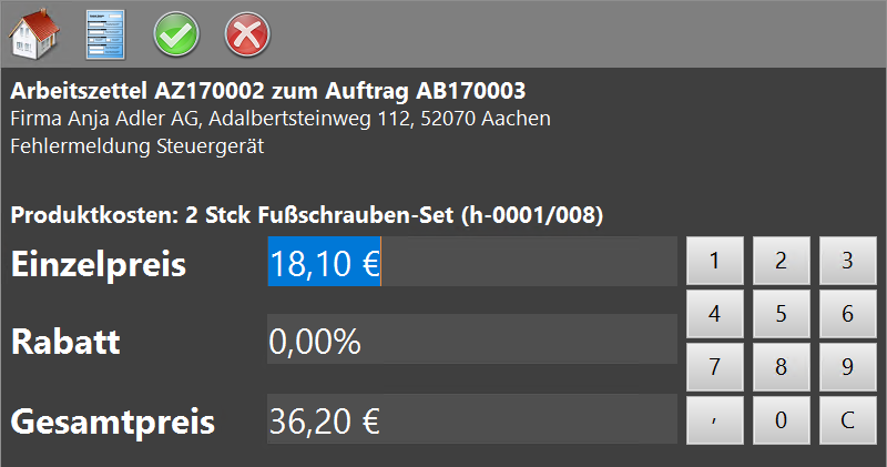 Eingabedialog des Arbeitszettels zum Erfassen des Materials. Tippen Sie auf