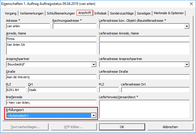 Der Erfüllungsort wird bei im Ausland erbrachten Leistungen für Privatkunden (nur Leistungen, keine Lieferungen!) zur automatischen Ermittlung des Steuersatzes verwendet und kann außer in den Adressstammdaten der Kundenadresse auch in den jeweiligen Vorgangseigenschaften eingestellt werden: