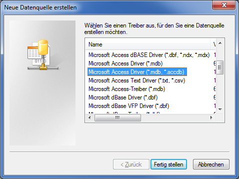 "Microsoft Access Driver (*.mdb, *.accdb)"aus:Wählen Sie .