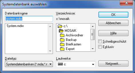 "System.mdw"-Benutzerdatenbank aus (z.B.C:\Mosaik\System.mdw) aus drücken Sie anschließend auf .Achten Sie unbedingt darauf, dass die Datei