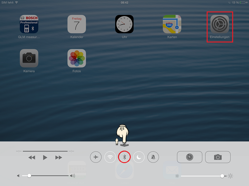 Die Anbindung des Gerätes an das Tablet erfolgt per Bluetooth-Schnittstelle, die standardmäßig in Ihrem iPad verfügbar ist. Allerdings müssen Sie diese unter Umständen sowohl auf dem Tablet als auch auf dem Distanzmessgerät zunächst noch aktivieren.