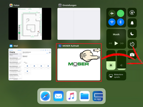 Tippen Sie auf die App Moser Aufmaß (falls verfügbar) und wischen Sie diese aus dem Bildschirm, um sie endgültig zu beenden.