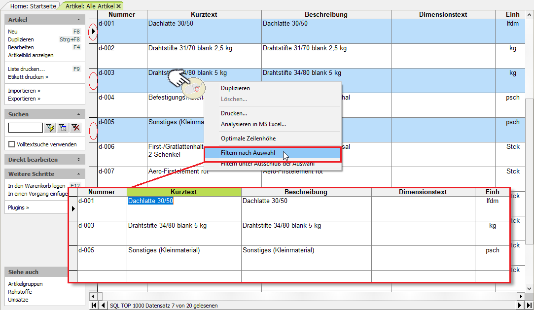 | Darüber hinaus können Sie auch mehrere beliebige Datensätze markieren (z.B. Strg+Mausklick oder Umschalt+Mausklick) und anschließend darauf mit der rechten Maustaste im Kontextmenü den Punkt wählen, um die aktuelle Ansicht auf genau diese ausgewählten Datensätze zu reduzieren. Alle nicht markierten Tabelleneinträge werden ausgeblendet. |