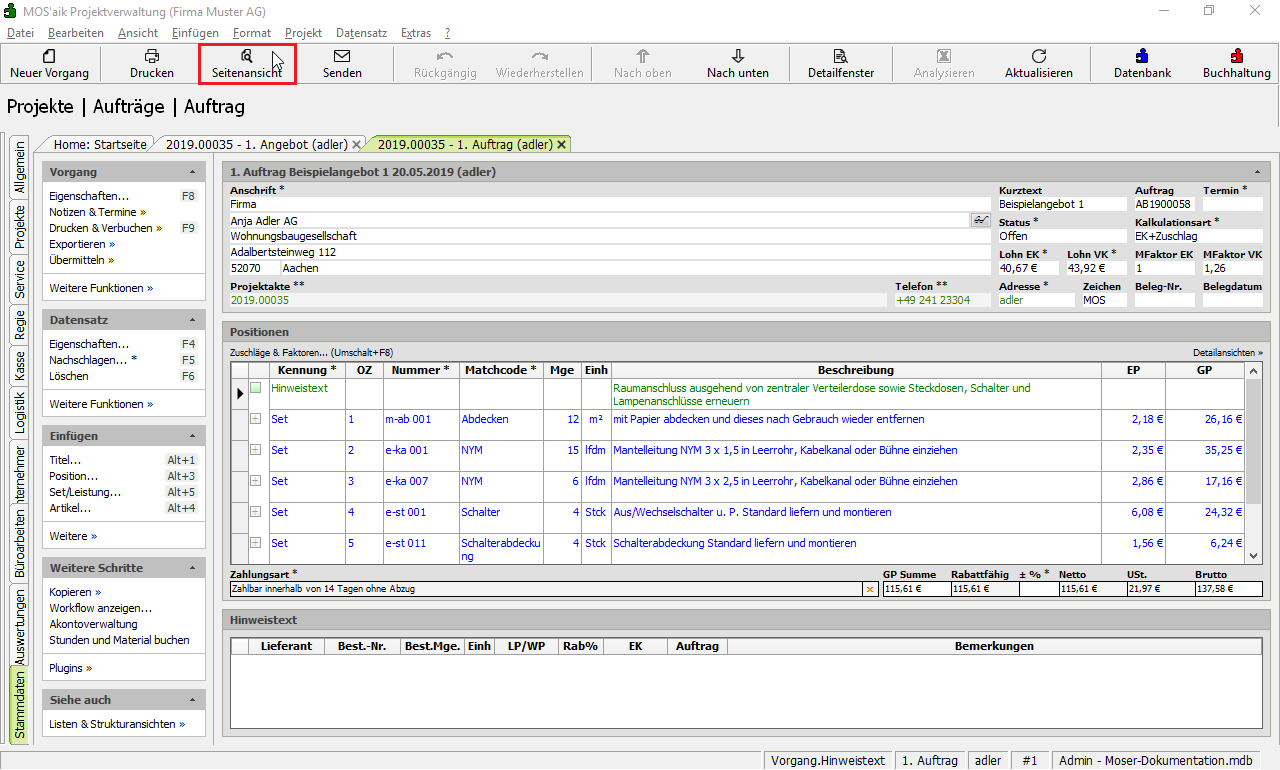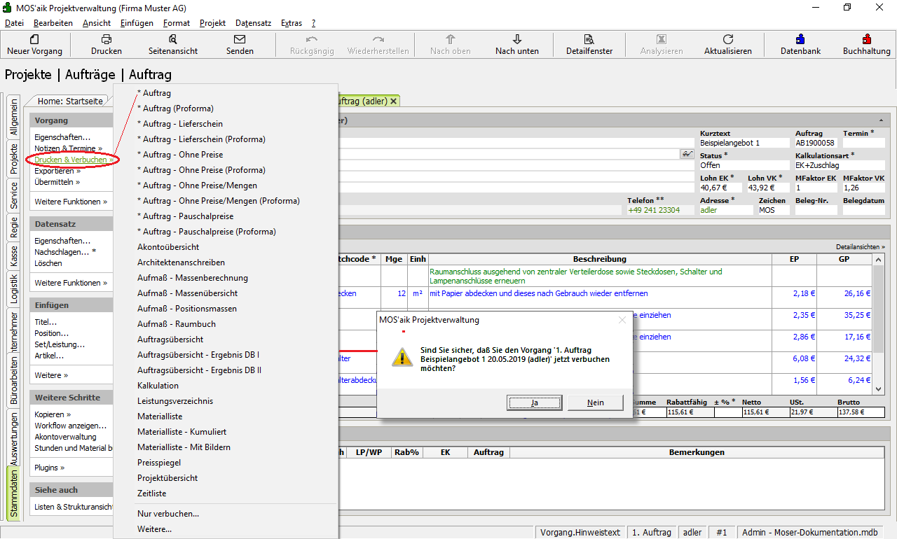 Der Auftrag wird durch den Druck automatisch verbucht und ist damit