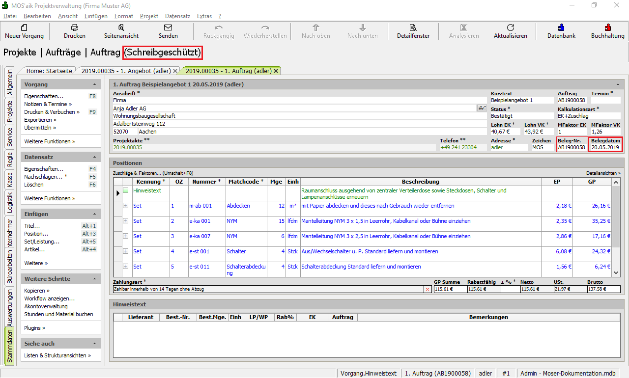 Ein bestehender Auftrag wird zunächst geöffnet.
