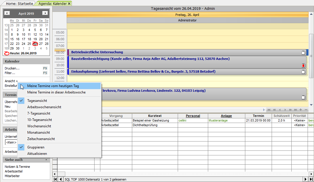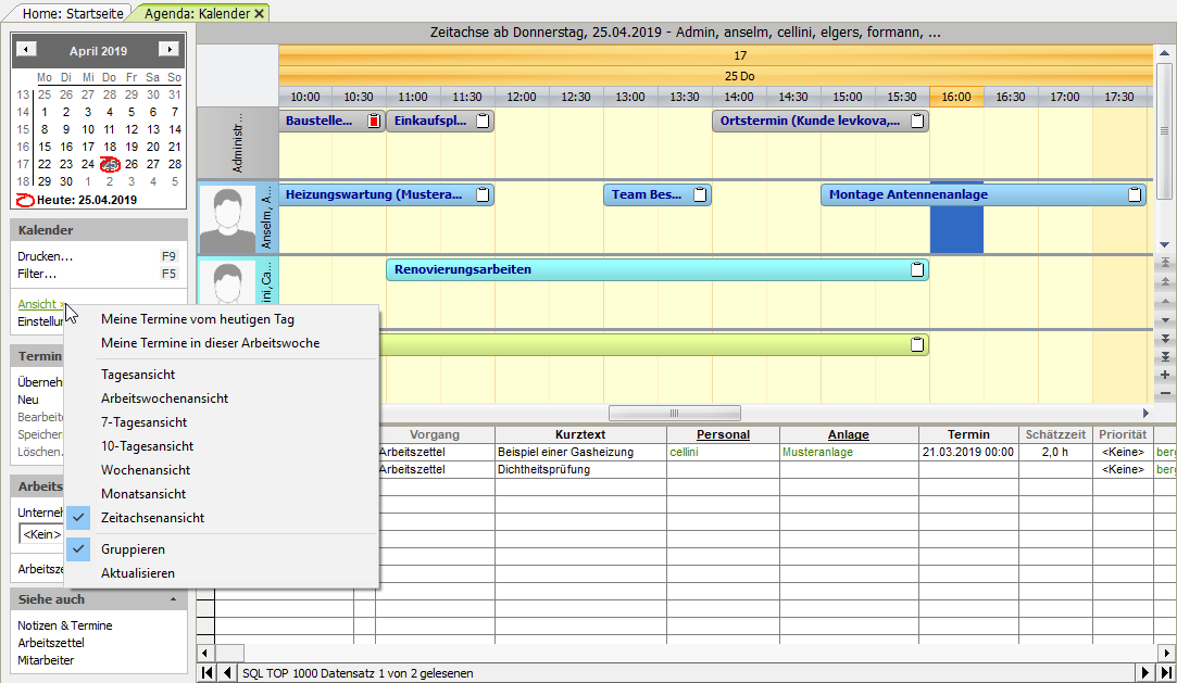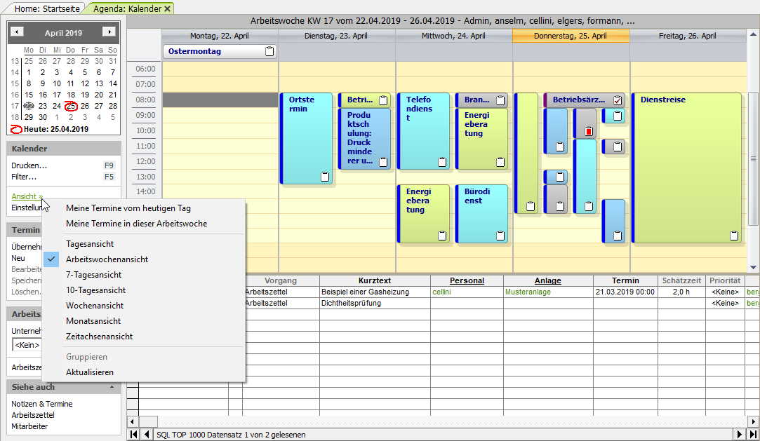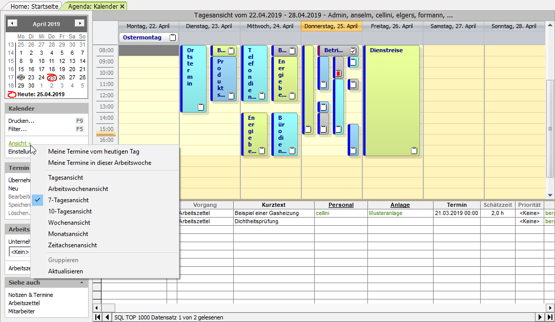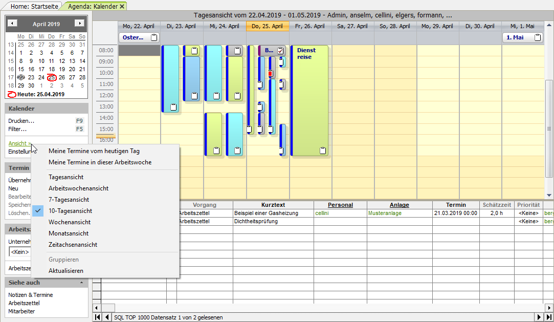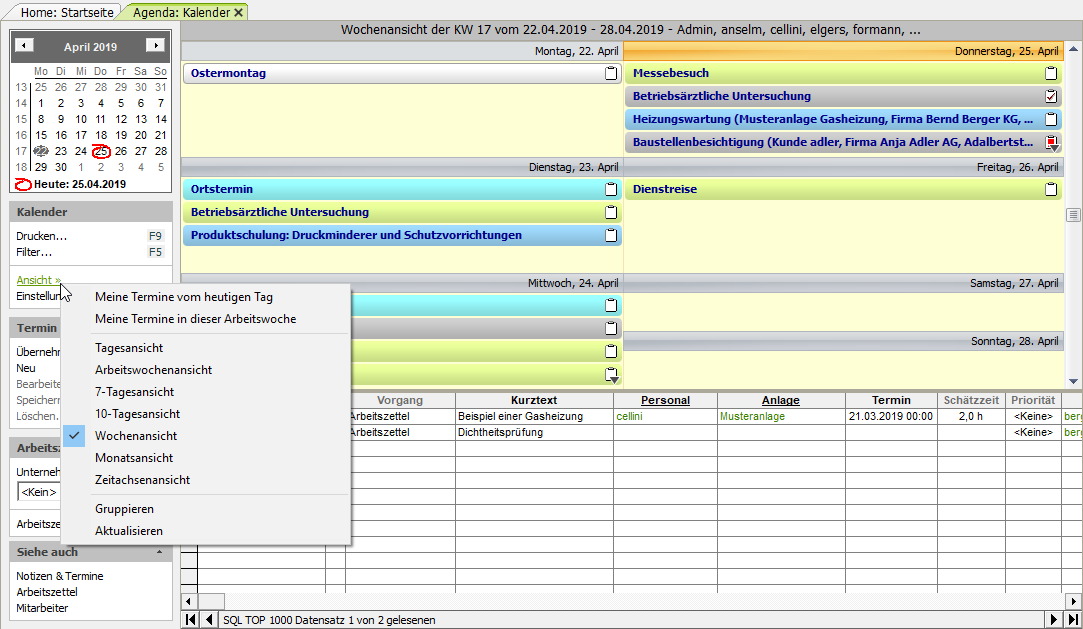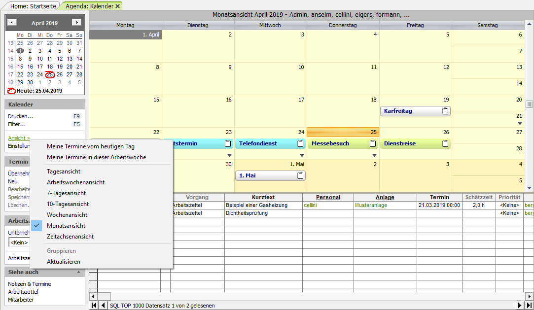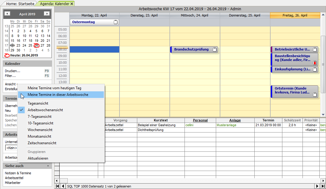 [a] Für die eindeutige Zuordnung eines Mitarbeiters zum Termin ist es für die Verwendung der Kontextmenüfunktionen (Neuer Termin, Neuer Ortstermin, Neuer Wartungstermin, Neuer Kundentermin (extern), Neuer Kundentermin (intern), Neue Aufgabe) erforderlich, dass Sie der Kalenderansicht zuvor mit der Funktion Filter... F5 genau einen Mitarbeiter zuordnen.