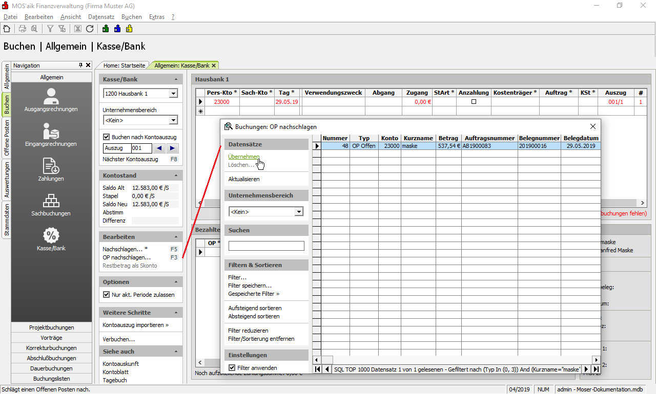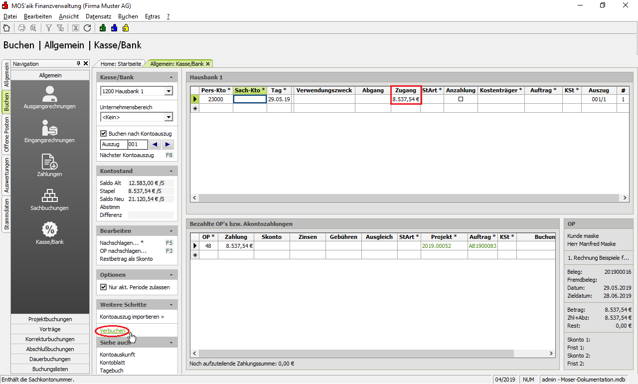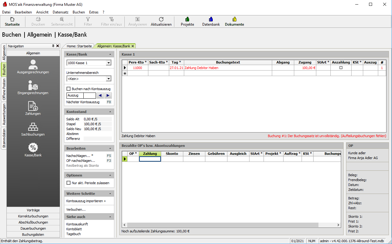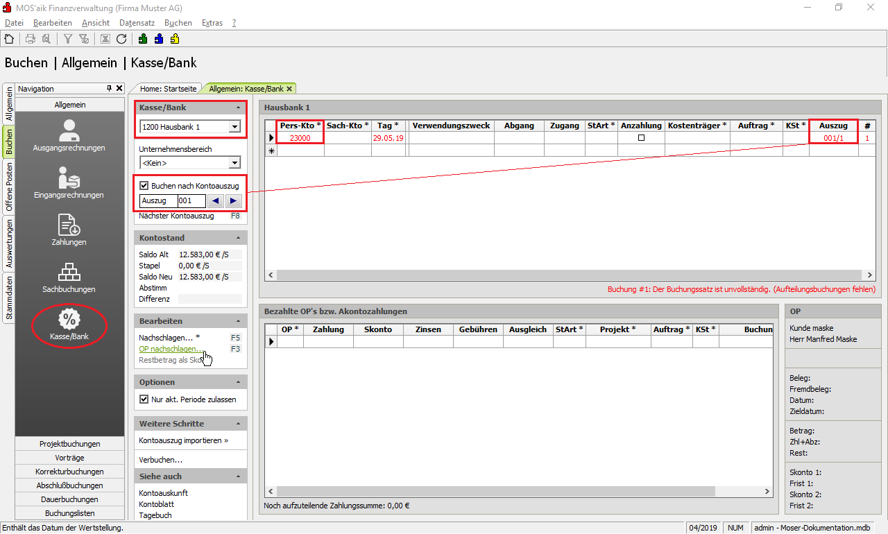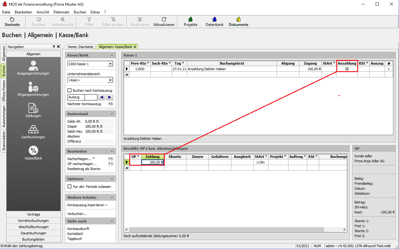 4.7.2.2. Zahlungen mit dem Arbeitsblatt "Kasse/Bank" (FV)