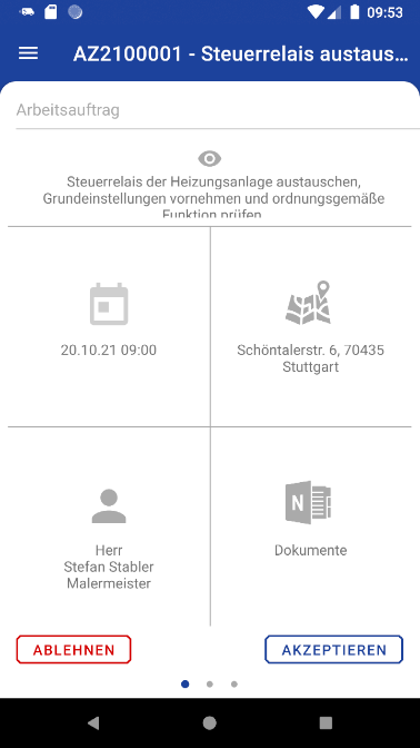 Handelt es sich um einen neuen Auftrag, müssen Sie die Bearbeitung zunächst bestätigen. Dazu werden Ihnen Termin und Arbeitsauftrag angezeigt: