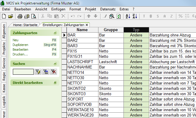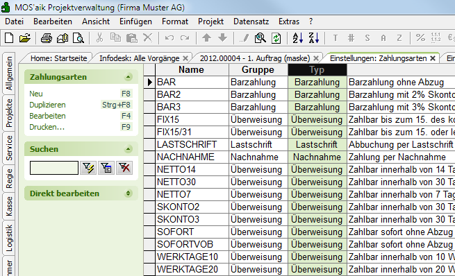 Rechnung, Lastschrift Nachnahme usw.). Bei der Erstinstallation von