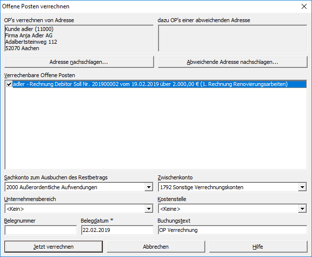 Verrechnen. Wählen Sie im DialogVerrechnendie "abweichende Adresse" und dort den OP auf den die Umbuchung durchgeführt werden soll. -