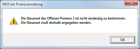 Das Verrechnen von Offenen Posten in Projekten mit Sicherheitsleistungen ist mit dieser Funktion nicht möglich, da die erforderliche Angabe einer Steuerart zum OP fehlt. In einem solchen Fall wird folgende Meldung mit einem Verweis auf die verursachende Position ausgegeben: