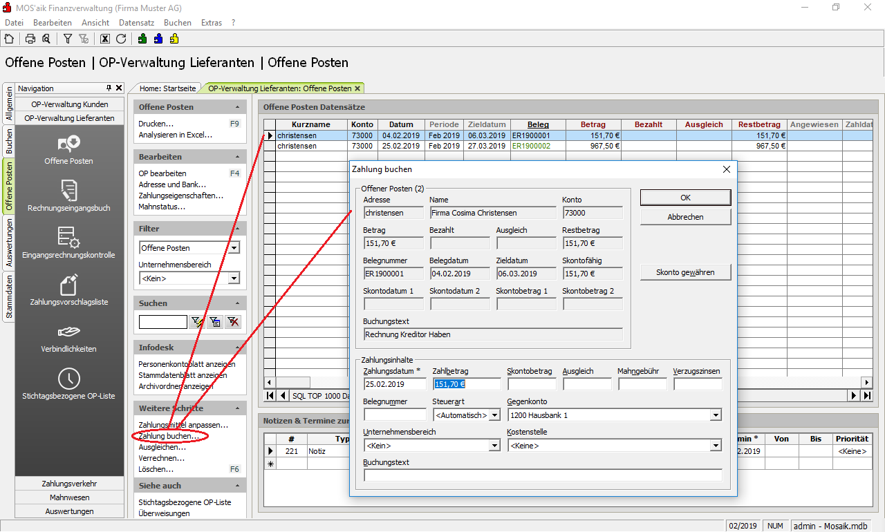Zahlung zu einem Offenen Posten erfassen. Dazu markieren
