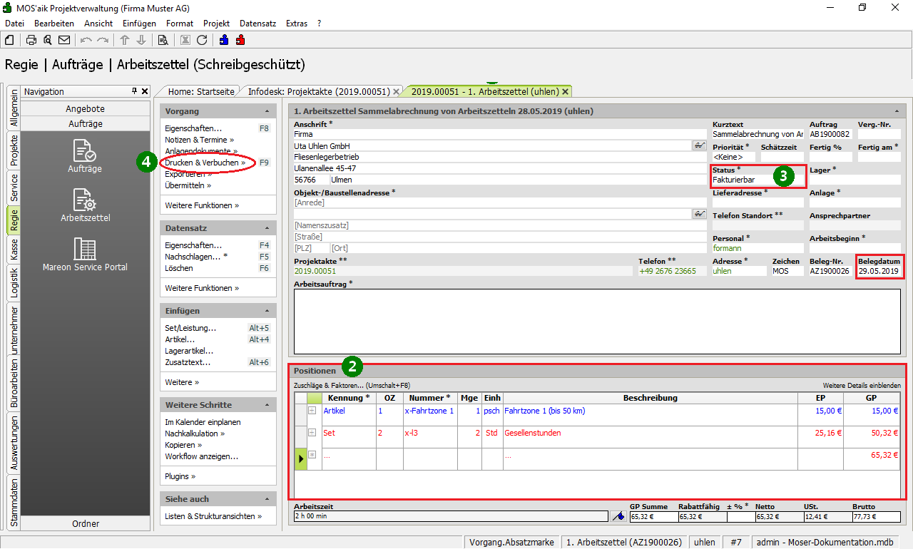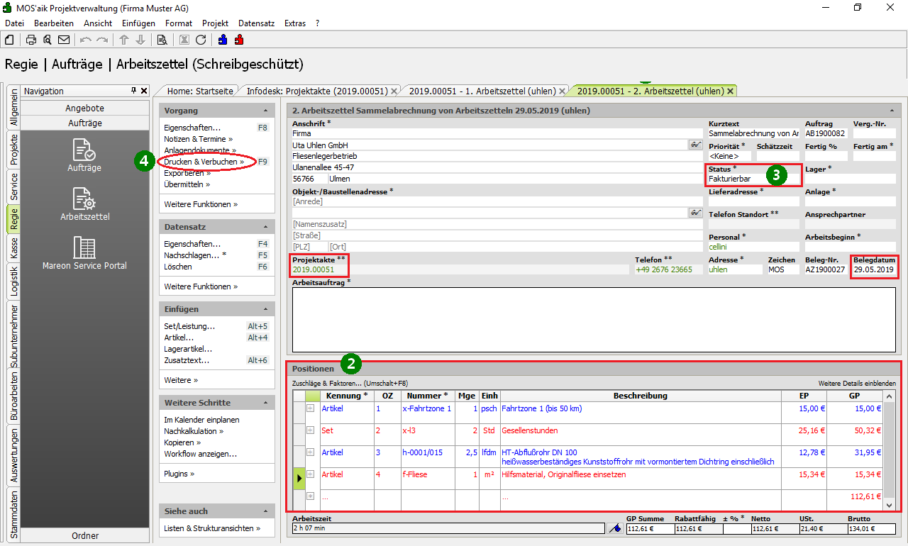 den Status des Arbeitszettels auf "Fakturierbar“3 und verbuchen Sie diese anschließend mit