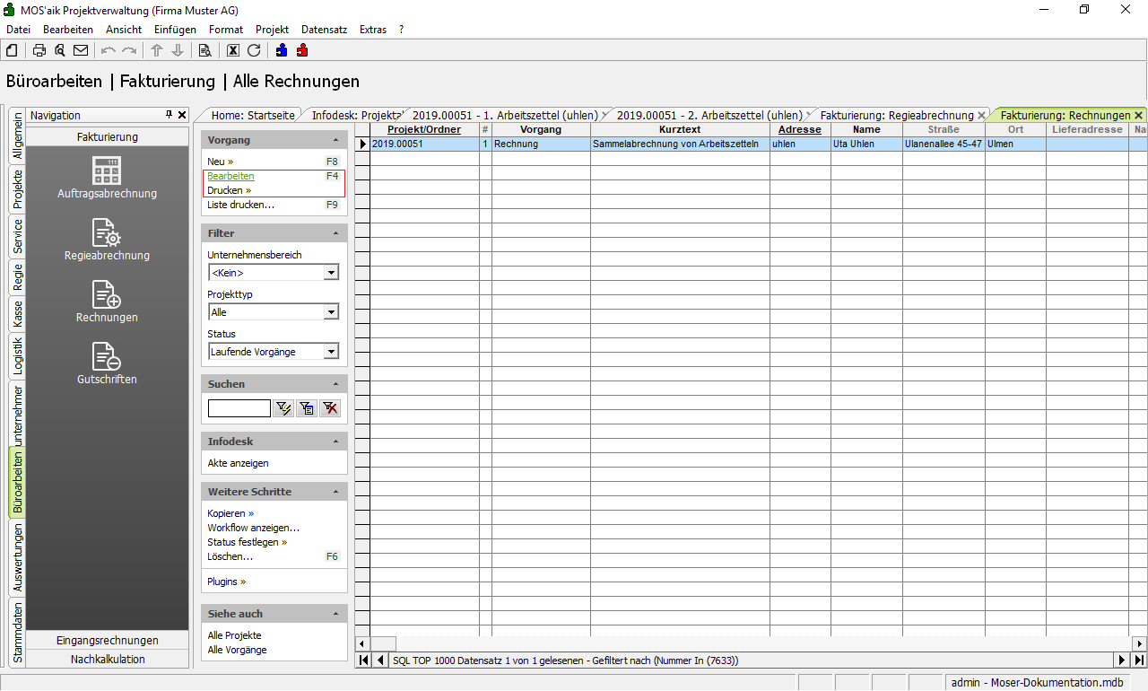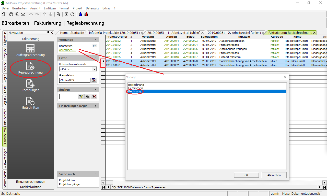 öffnen Sie das Arbeitsblatt Büroarbeiten | Fakturierung | Regieabrechnung.