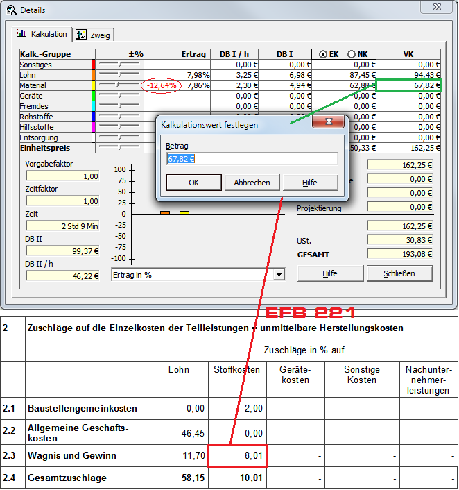 Zur Vereinfachung werden hier nur die Kalkulationsgruppen Material und Lohn eingesetzt. Es wird jedoch im Folgenden auch auf die Berechnung anderer Teilleistungen im EFB eingegangen.