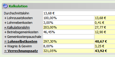 Der Verrechnungslohn wird aus der Summe aller Lohnverkaufspreise über die Summe der Lohnzeiten gemittelt: