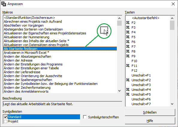 Um die aktuelle Funktion eines Symbols auf der Symbolleiste zu bestimmen, öffnen Sie ebenfalls den "Anpassen"-Dialog und klicken Sie dann auf das Symbol. Damit wird das zugehörige Makro sowie eine eventuell hinterlegte Tastenkombination für den Schnellzugriff im Bereich Tasten angezeigt.