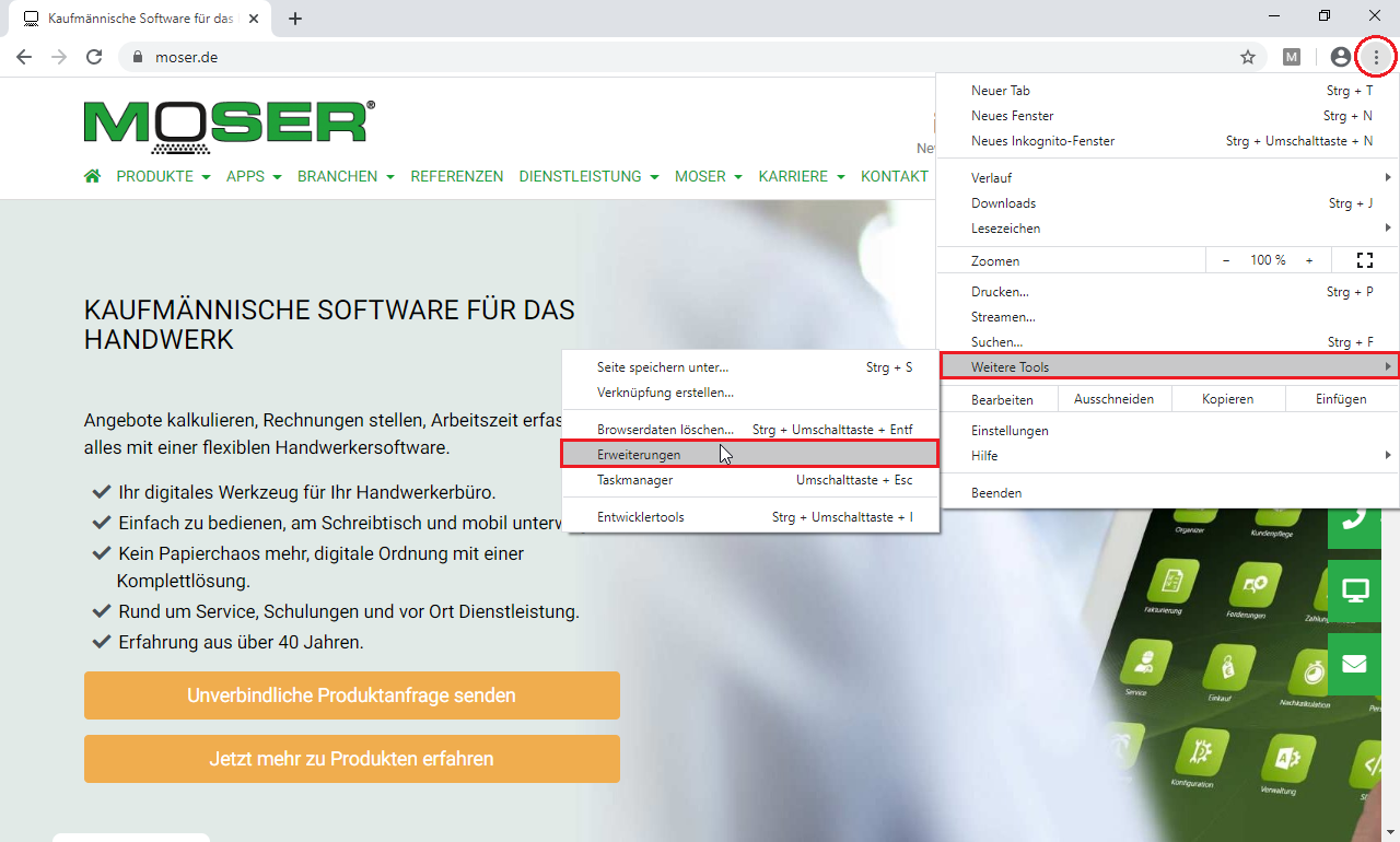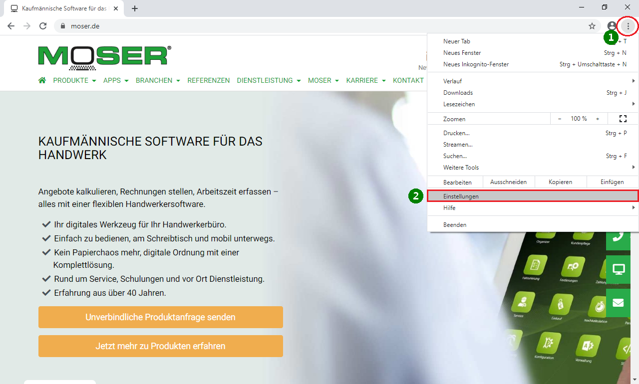 Stellen Sie mit den folgenden Schritten sicher, dass der Internetbrowser Google Chrome betriebsbereit installiert ist und richten Sie diesen wie folgt ein: