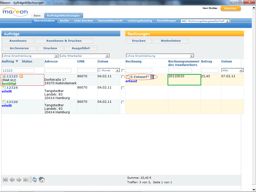 Am Rechnungsstatus bzw. dem Status des Leistungsnachweises ist nun erkennbar, dass die Rechnung an das Wohnungsunternehmen weitergeleitet wurde: