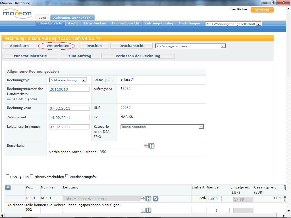 Weiterleitenwird die Rechnung an das Wohnungsunternehmen übertragen.