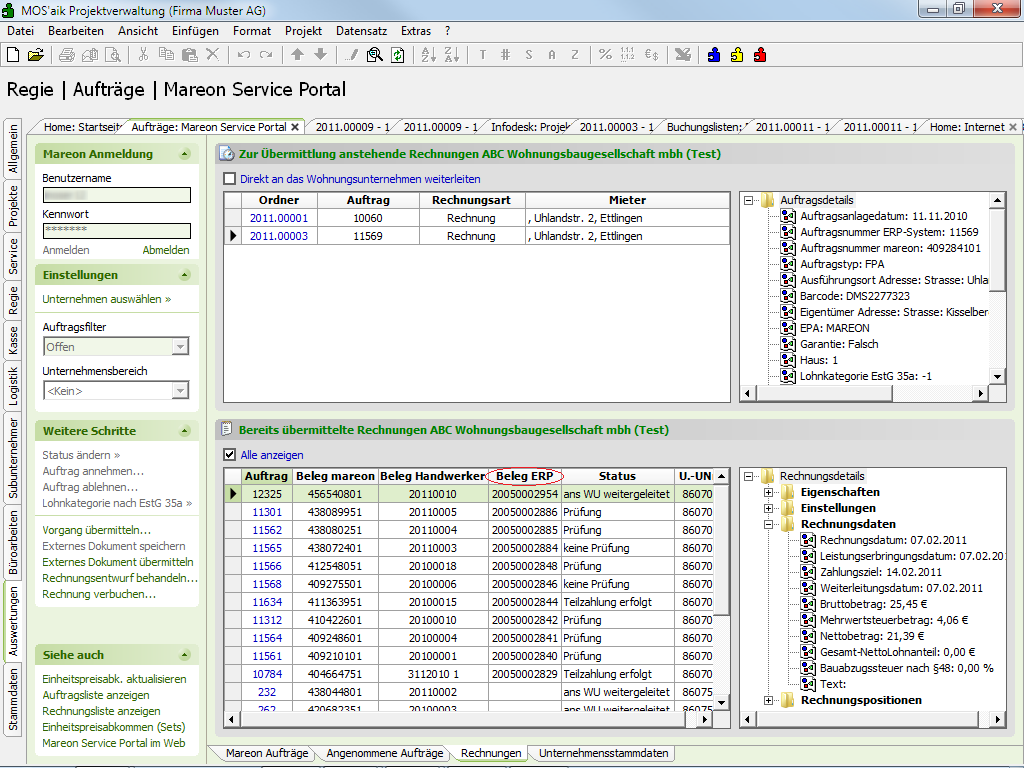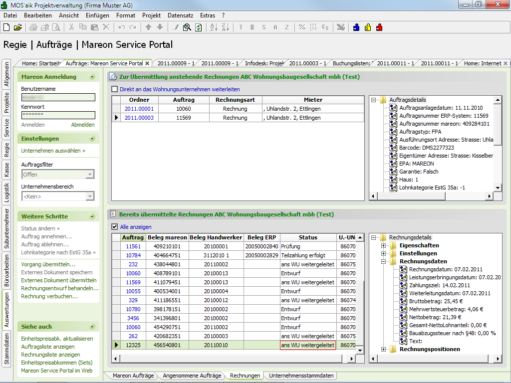 Wählen Sie in MOS'aik unter Regie | Aufträge | Mareon Service Portal die Funktion