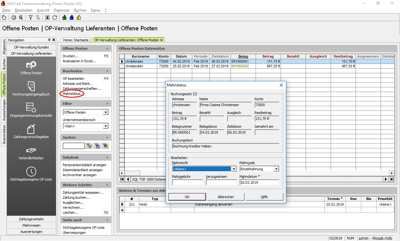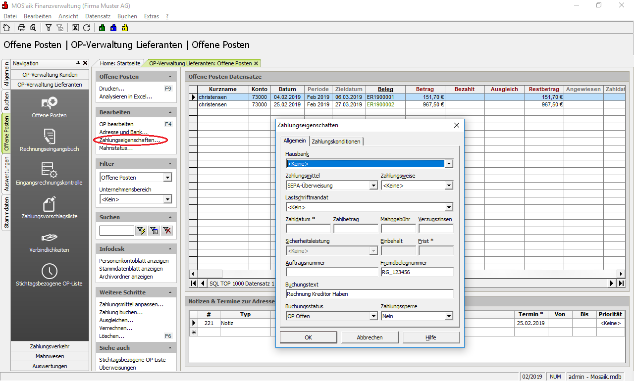 Sie können im Nachhinein folgende Informationen, die beim OP hinterlegt sind, ändern. Markieren Sie einfach einen Offenen Posten und wählen die entsprechende Funktion aus:
