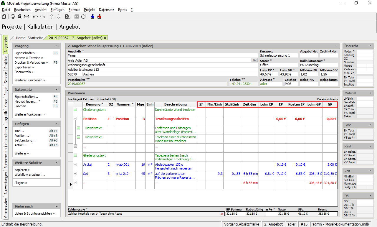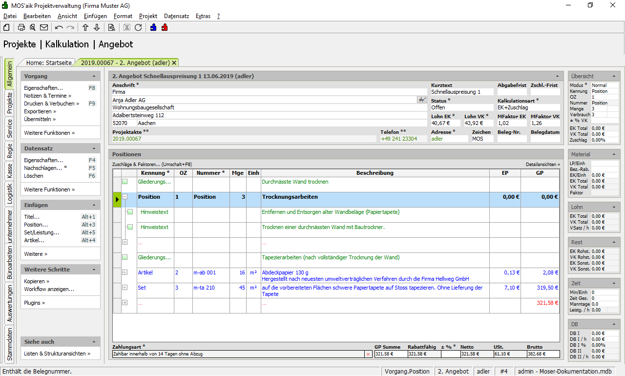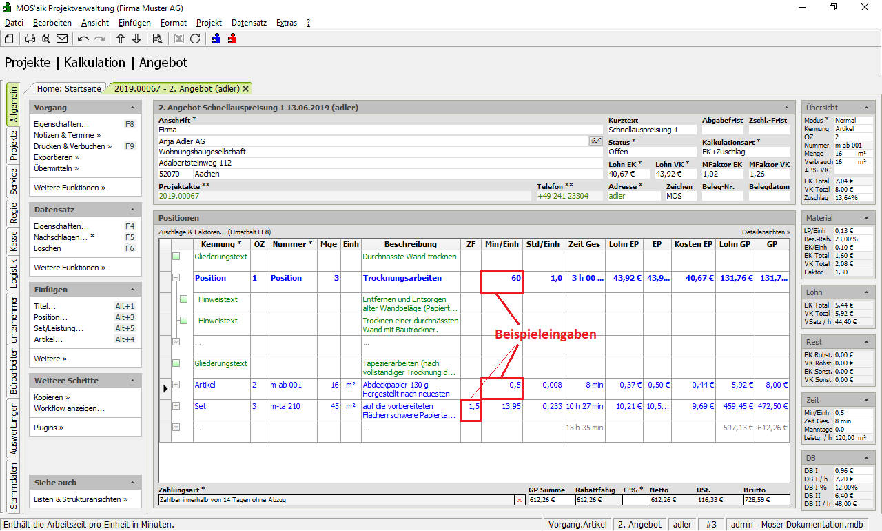 Zur Demonstration wird ein Angebotsvorgang mit unterschiedlichen
