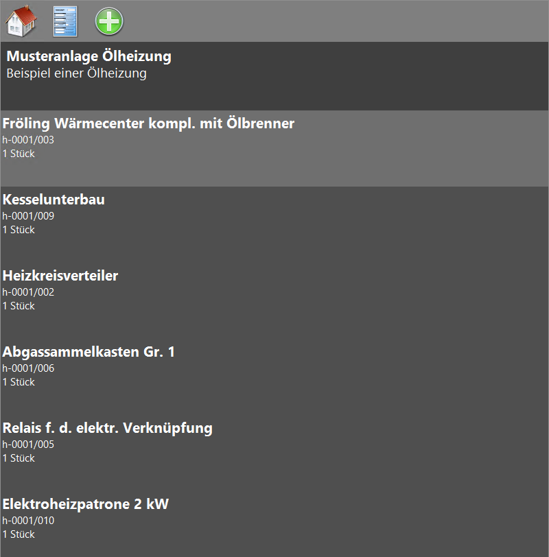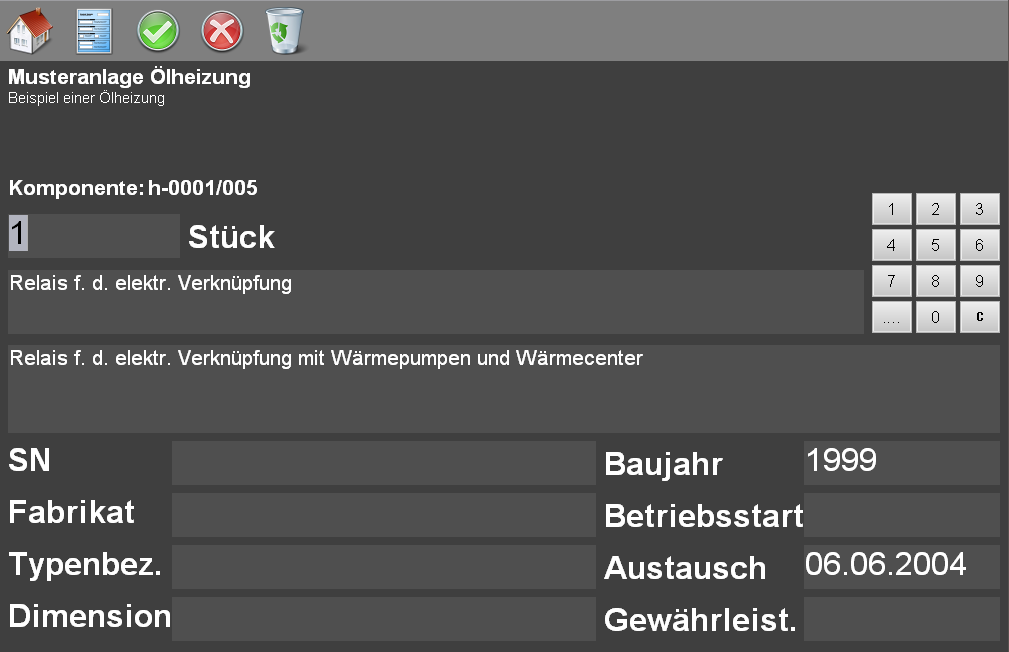 Wählen Sie eine Komponente durch Antippen und geben Sie im nachfolgenden Dialog weitere Details, wie z.B. die verbaute Stückzahl, das Fabrikat, die Seriennummer, etc. ein. Tippen Sie auf das Symbol