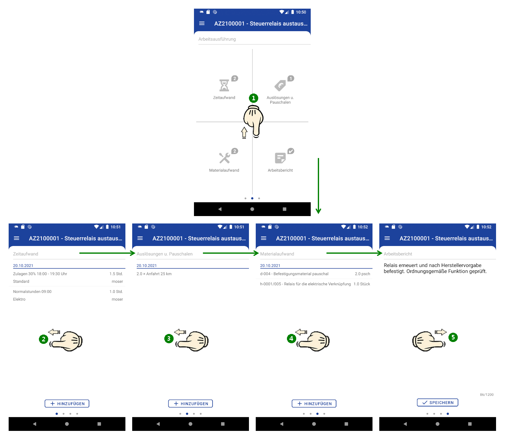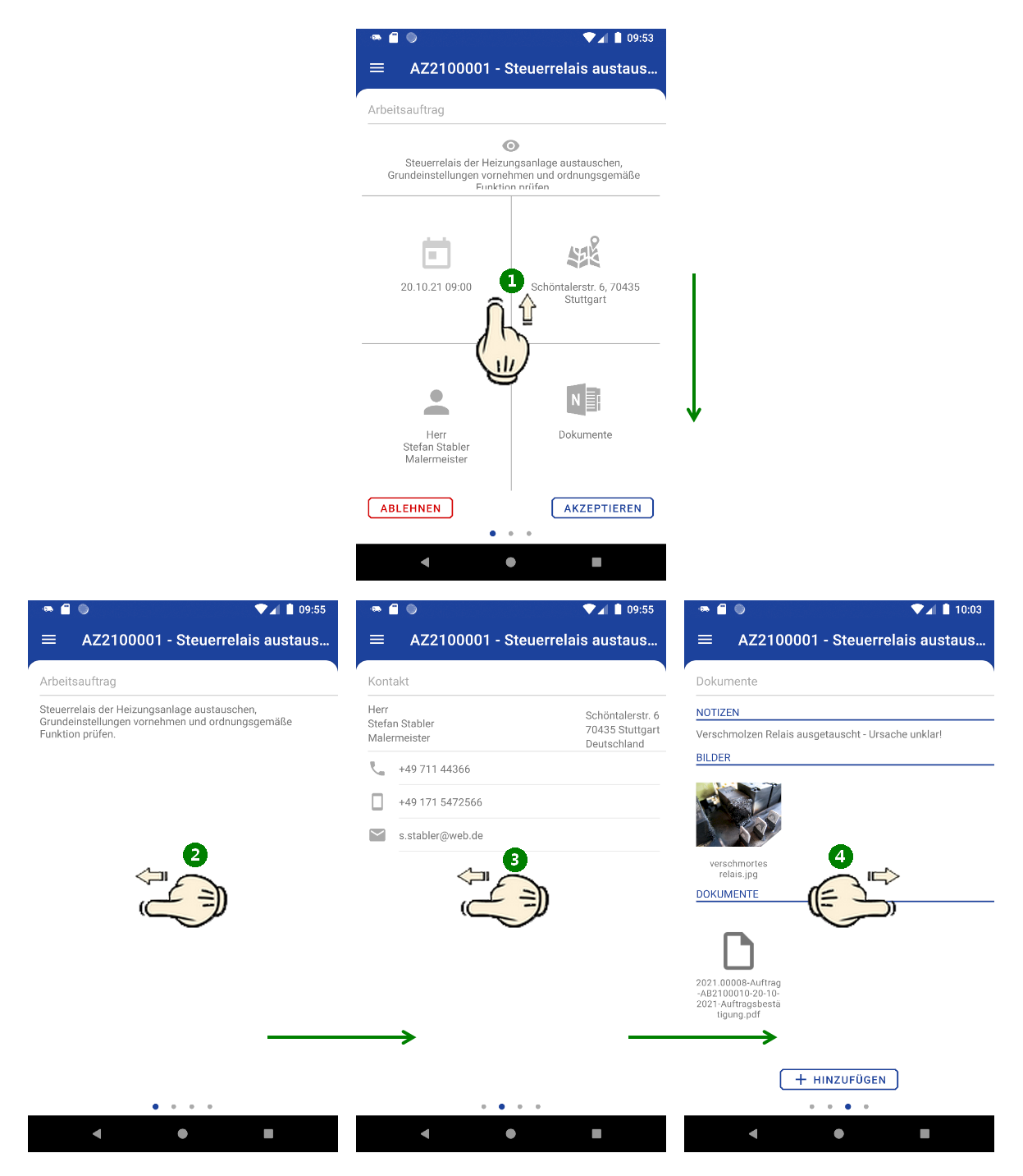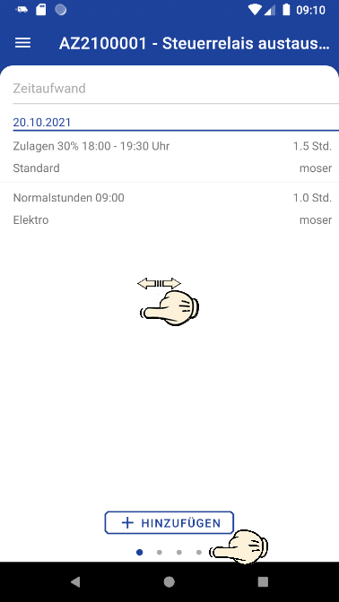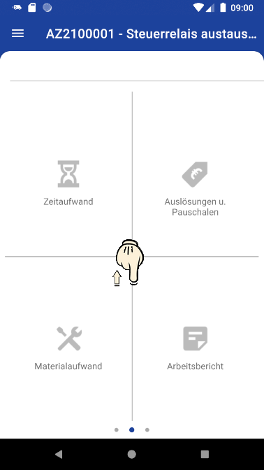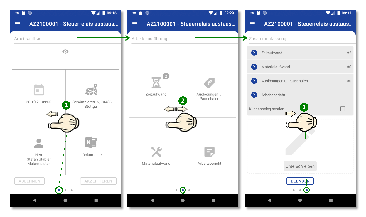 Die App bietet zur Bearbeitung von Kundeneinsätzen verschiedene Ansichten mit zum Teil mehreren Anwendungsebenen, die über Wisch-Gesten einfach gewechselt werden können.