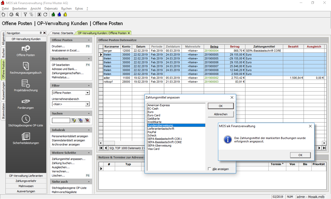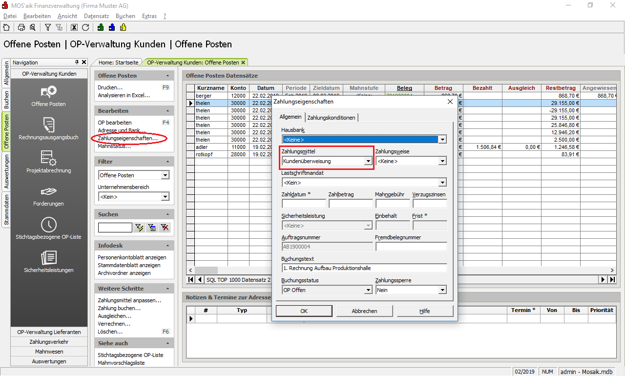 Das Zahlungsmittel wird normalerweise durch die Einstellung im Personenkonto gesteuert und automatisch vergeben. Falls Sie dennoch Veränderungen vornehmen müssen, markieren Sie einen oder mehrere Offene Posten in der OP-Liste (Kunden/Lieferanten) und passen die Einstellung mit einer der folgenden Möglichkeiten an: