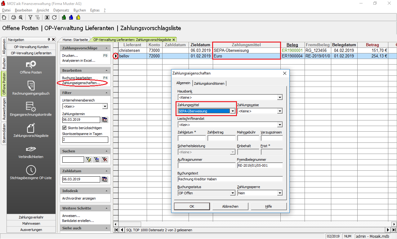 8.3.2.1. Zahlungsmittel anpassen (Zahlungsvorschlagsliste)