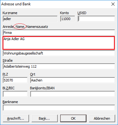 Adresse und Bankverbindung (Funktion |