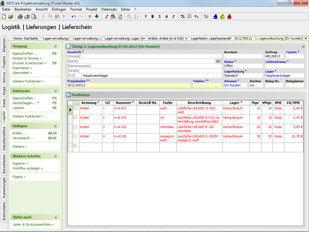 Es wird automatisch ein Lieferschein zur Umlagerung der Artikel aus dem Hauptlager erstellt. Bei Bedarf können die ermittelten Mengen im Lieferschein geändert werden: