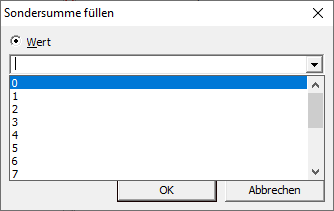 Jetzt geben Sie den Wert (0-15) ein oder suchen ihn aus und bestätigen . Es folgt eine Sicherheitsabfrage, ob Sie die Änderung für jeden einzelnen Datensatz bestätigen wollen. Wählen Sie hier "Nein". Die Sondersumme wird danach automatisch in alle gefilterten Datensätze eingetragen. Wiederholen Sie diesen Vorgang für jede Kalkulationsgruppe. (Siehe dazu auch das FAQ - Spalte füllen.) |
