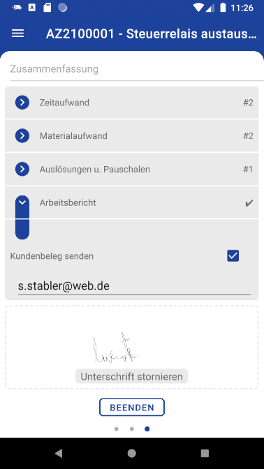 Nach Fertigstellung der Arbeiten, Erfassung aller Kosten und des Arbeitsberichts wechseln Sie in den Bereich Zusammenfassung und wählen den Punkt Unterschreiben. Ihre erfassten Buchungen werden hier nochmals zusammengefasst angezeigt.
