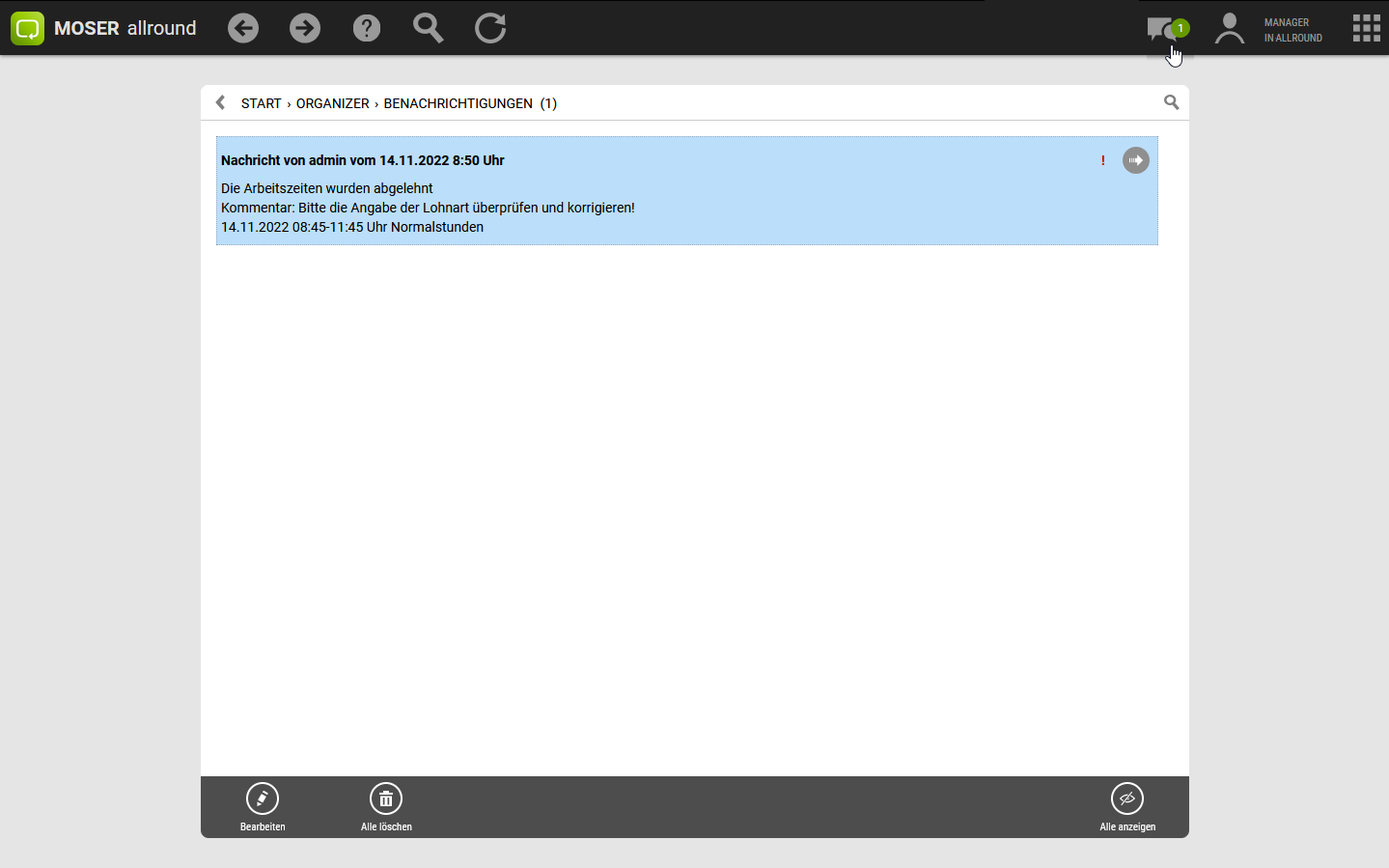 Abgelehnte Zeiterfassungen werden außerdem über eine Benachrichtigung in der Navigationsleiste angezeigt.