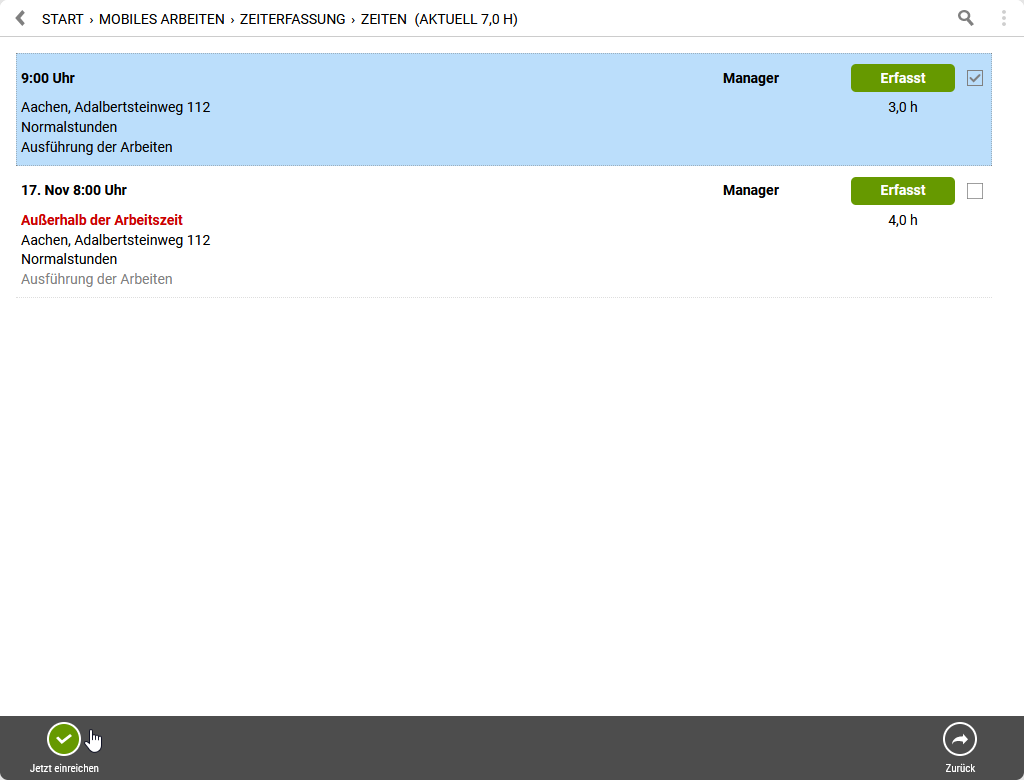 Erfasste Buchungen sind vollständig und enthalten sowohl eine Startzeit als auch ein Ende. Die Buchungen liegen damit dem Vorgesetzten zur Genehmigung vor (siehe ).