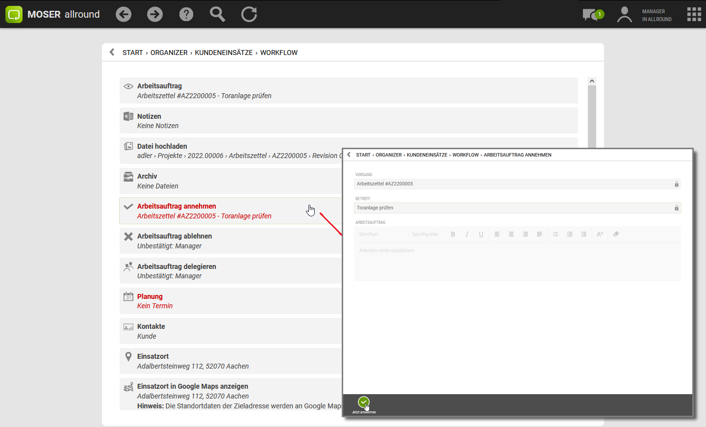 Die folgenden Ablaufbeispiele zeigen, wie Checklistenvorlagen erstellt, im Archiv hinterlegt, einem Kundeneinsatz zugeordnet und vom Mitarbeiter ausgefüllt werden: