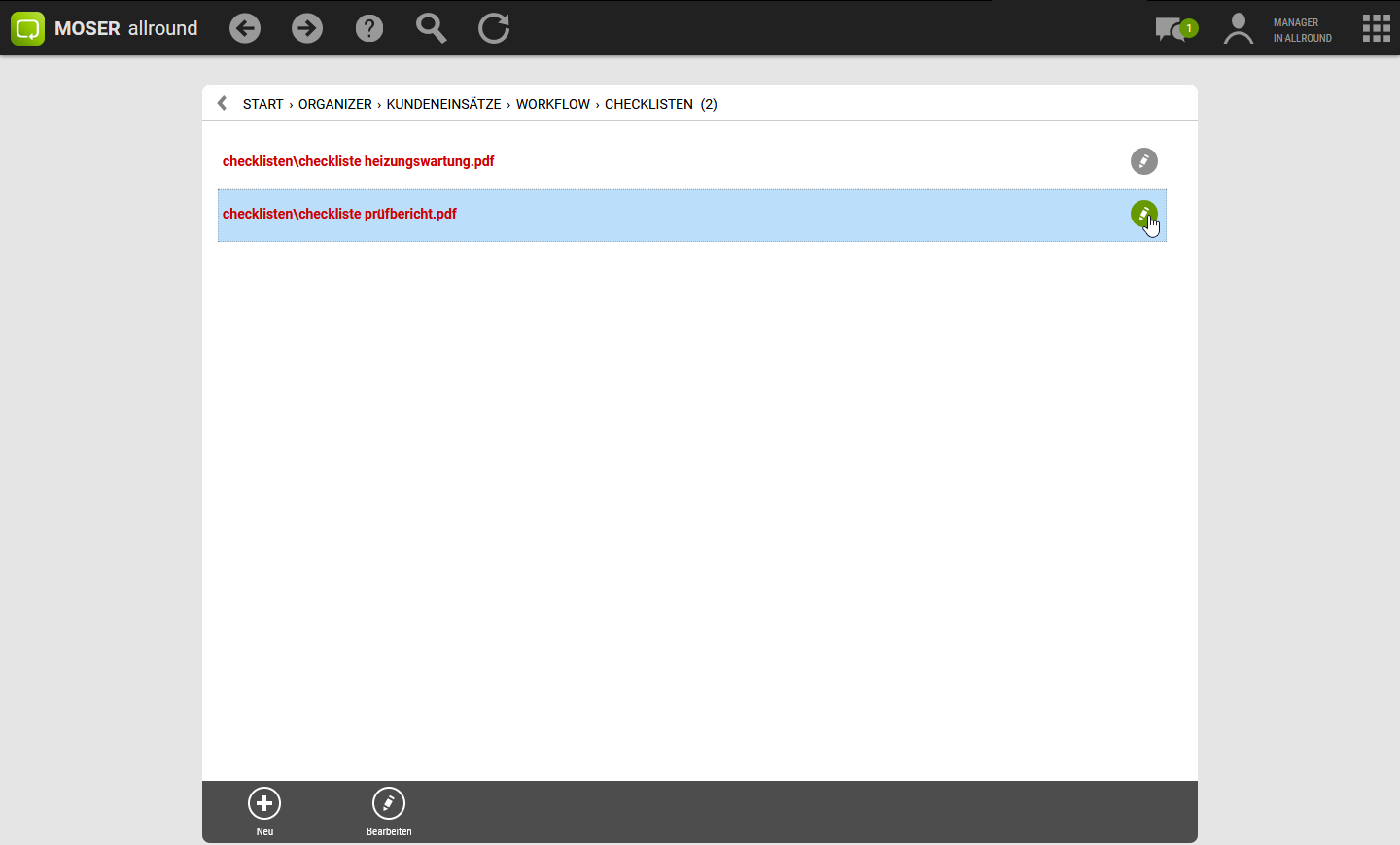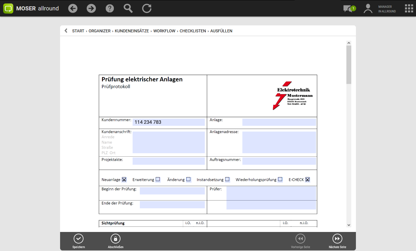 Sie können einem Arbeitsauftrag zur Dokumentation oder als strukturierte Arbeitsanleitung eine oder mehrere Checklisten zufügen. Die hinterlegten ein- oder mehrseitigen Formulare können vom Mitarbeiter aktiv ausgefüllt und abgespeichert werden.