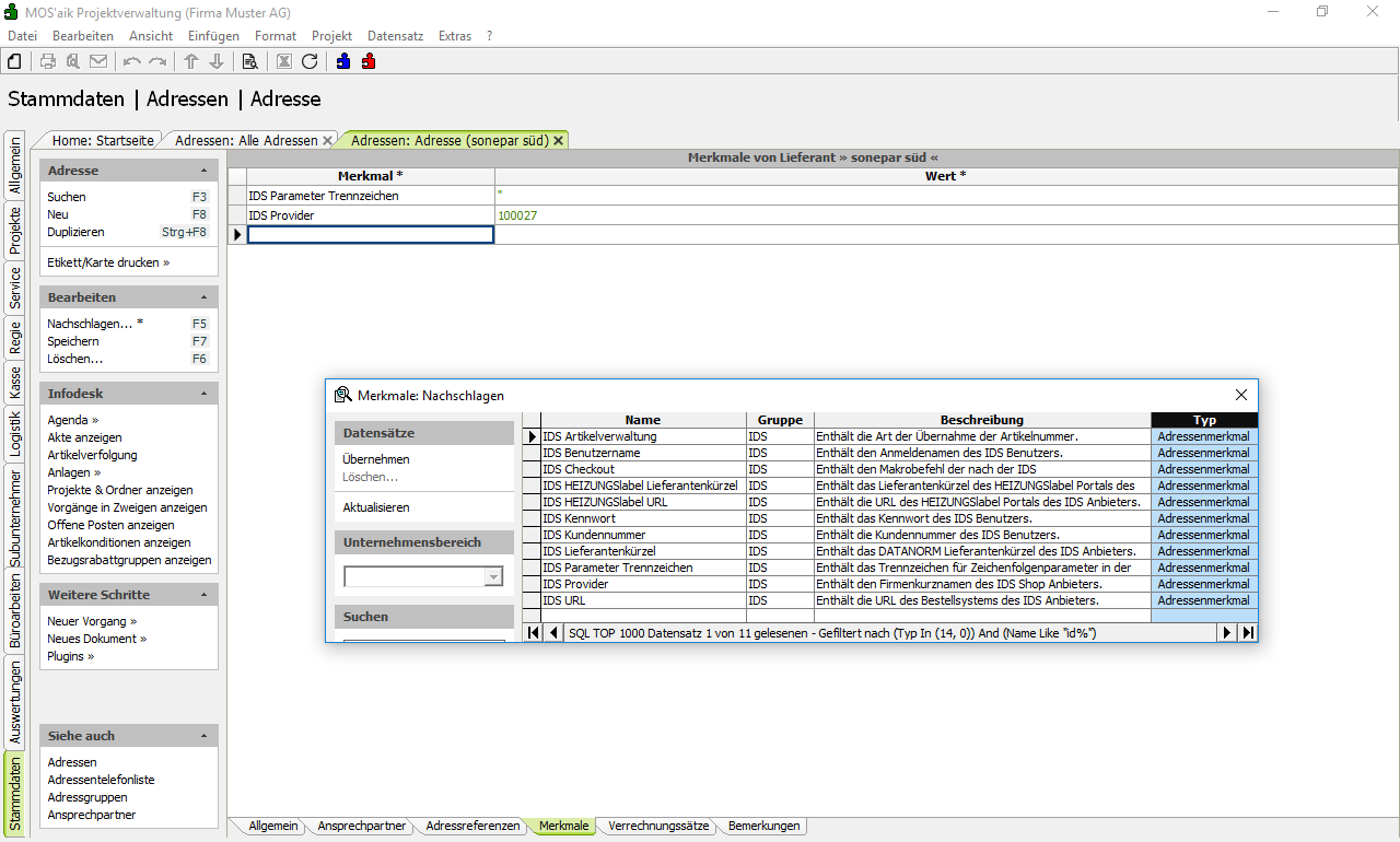Zentrale Zugangsdaten für die Anmeldung am Lieferantenportal werden in MOS'aik als "Merkmale" zur jeweiligen Lieferantenadresse hinterlegt: