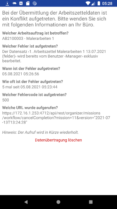 Sollte der Fehler nicht gelöst werden können, können Sie alle noch nicht übermittelten Änderungen (z.B. Arbeitsbericht, Fertigstellungsgrad, Kostenbuchungen, Dokumente, Notizen, ...) des betreffenden Kundeneinsatzes über die Schaltfläche Datenübertragung löschen nach einer Sicherheitsabfrage löschen.