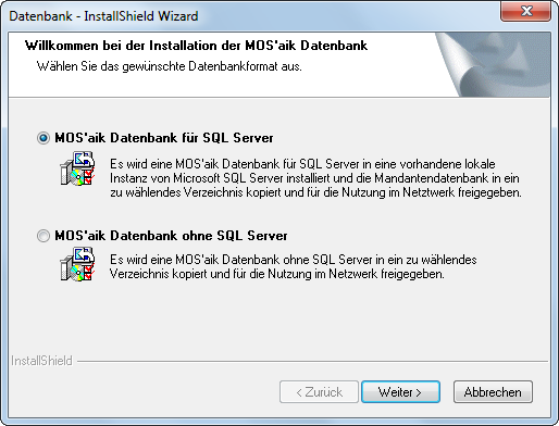 Während des Updates erscheint der nebenstehend abgebildete Dialog. Im Regelfall ist hier bereits Ihre aktuell verwendete Datenbank korrekt voreingestellt. Falls nicht, wählen Sie zwischen der Datenbank mit und ohne SQL Server und klick Sie auf . |
